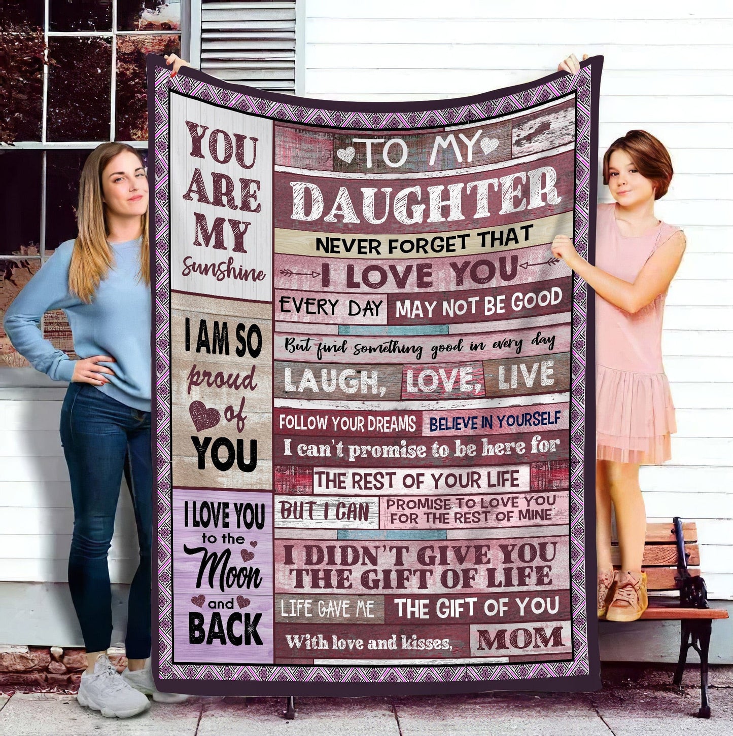 This fleece blanket is a warm and cozy hug from you to your dear daughter. Soft to the touch and perfect for snuggling up on the couch, this blanket will keep her comfortable on the coldest of nights. Every time she wraps herself in its warmth, she'll remember that she's never alone and that her mom is always there to love and support her. This blanket is a symbol of your love for her and it will bring her comfort and happiness for years to come.